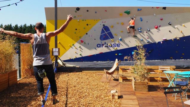Bienvenue chez Arkose Tours, Découvrez notre blocpark de 1500m² à 10 min du centre-ville. Cet ancien bâtiment de stockage des années 1975 a été réhabilité pour vous proposer des espaces de grimpe, une terrasse mais aussi grande nouveauté Arkose, une zone de bloc en extérieur de 500m².